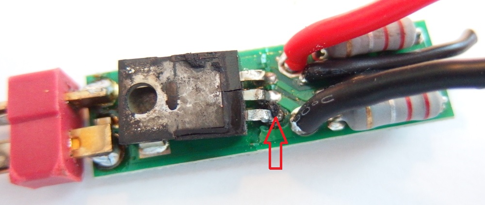 Z fotek je jasne videt, ze mosfet je skrz na skrz prohorely a popraskany, to muze zpusobit pouze extremny proud, ktery jim proteka. To podporuji i kontakty deanT konektoru, ktery jsou take opaleny. Nejvetsi pravdepodobnost tohoto jevu je zkrat na kabelazi mezi plusem a minusem v oblasti mezi aktivni brzdou a motorem. Po vymene tohoto spaleneho mosfetu jsem vyzkousel funkcnost aktivni brzdy a ta je naprosto v poradku, tj. bezproblemu funguje i brzeni motoru i s 11.1V lipol baterii (nizke proudove zatizeni).