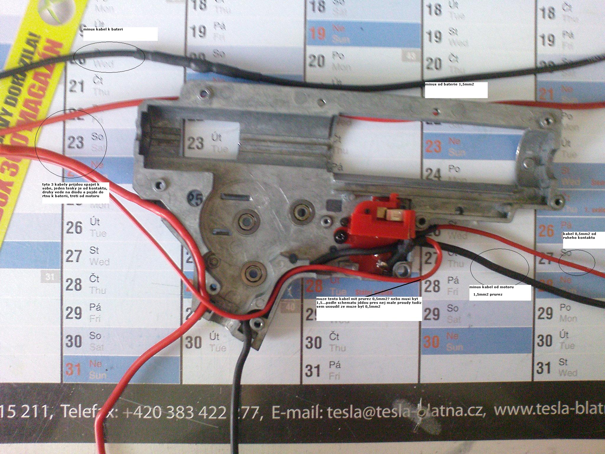 Zdraví. Dělám si spínání pomocí mosfetu do zbraně M4A1 RIS. Při instalaci kabeláže jsem se zasekl na mrtvém bodě, doslova jsem zamrznul. Mám v plánu mít mosfet v predbažbí, kde mám spoustu prostoru. A baterku mám v pažbě crane-ctock. Když jsem si zkoumal kudy mám jít kabeláží tak sem nebyl schopnej dojít na to jak ji mám udělat tak aby byla ve zbrani. A hlavně jak ji mám vyvést z mechaboxu. Našel jsem jeden prostor ale pak sem se zasek a nemám ponětí jak mám jít dále. Na obrázku sem zaznačil nově připájený kabel. Netuším zda jsem na dobré cestě či musím jít s kabeláží jinudy.