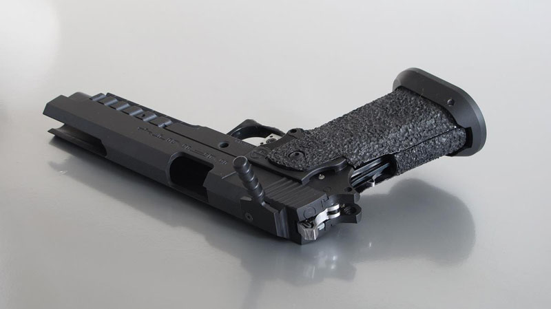 TM Hi-capa 5.1 - Limcat custom Gunsmith - Mike Cripps - EnglandZáver - ProHandgun Limcat Wildcat custom 6" + kompenzátor + oceľová vonkajšia hlaveň Rám - Tokyo Marui Hi-capa 5.1 čierna so striebornými ovládacími prvkami Elite Custom - 6" nerezová vnútorná hlaveň 6.02 mm ProHandgun duralová nastaviteľná spúšť - odpor 0,9 kg ProHandgun oceľové kladivo STI style magwell AIP loading nozzle NineBall HopUp AIP Blowback light unit Guarder springs 150% C-more replika AIP carbon montáž na optiku Elite Custom grip duralová naťahovacia páka hammer plate (ochrana záveru pred odtlačením od kladiva) duralový thumb rest AIP magazine bases - duralové - strieborné Skrátený chod záveru - short stroke buffer